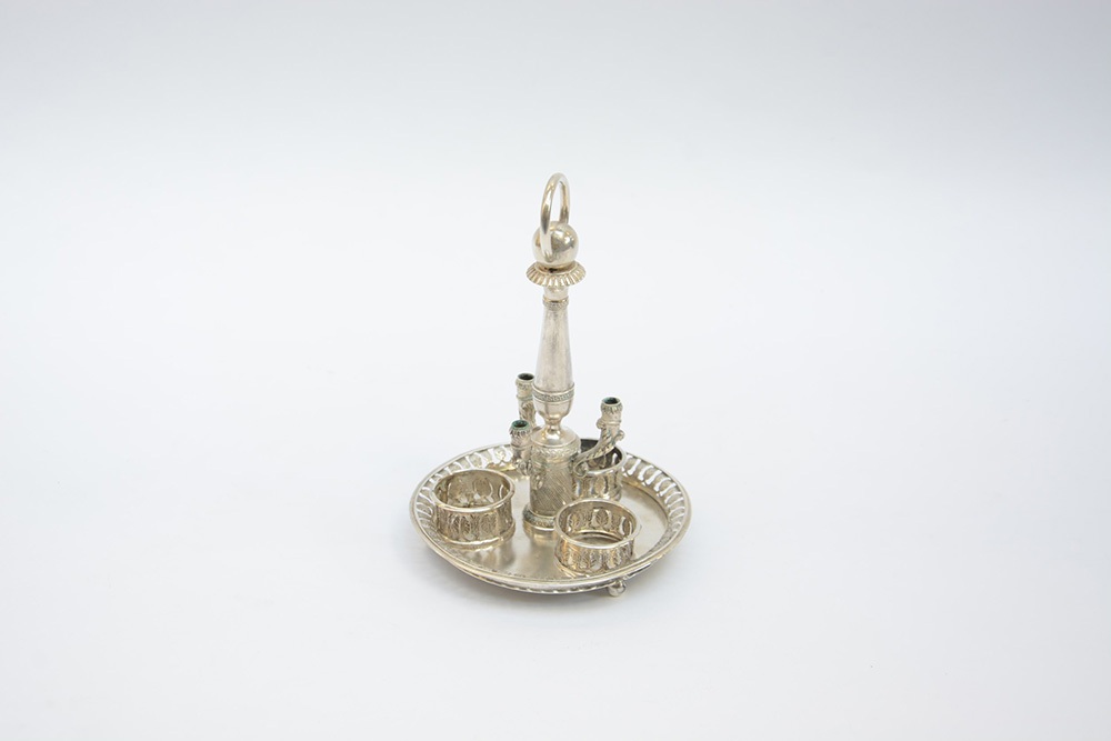 Calamaio in argento con base circolare e porta flaconi a ringhiera traforata decorata a palmette, presa ad anello con colonna a balaustro con tre reggi penne a cornucopia. Regno Lombardo Veneto, Milano 1834-1843. Argentiere Perelli e Elli (h. cm 20,5;d. cm 14,5) (gr 275 ca.) (difetti e mancanze)