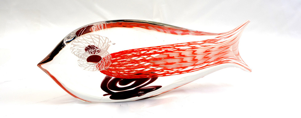 Manifattura di Murano, grande scultura raffigurante pesce in vetro, decorata a striature rosse e bianche. Firmata F. Onesto sotto la base (lunghezza cm 53)