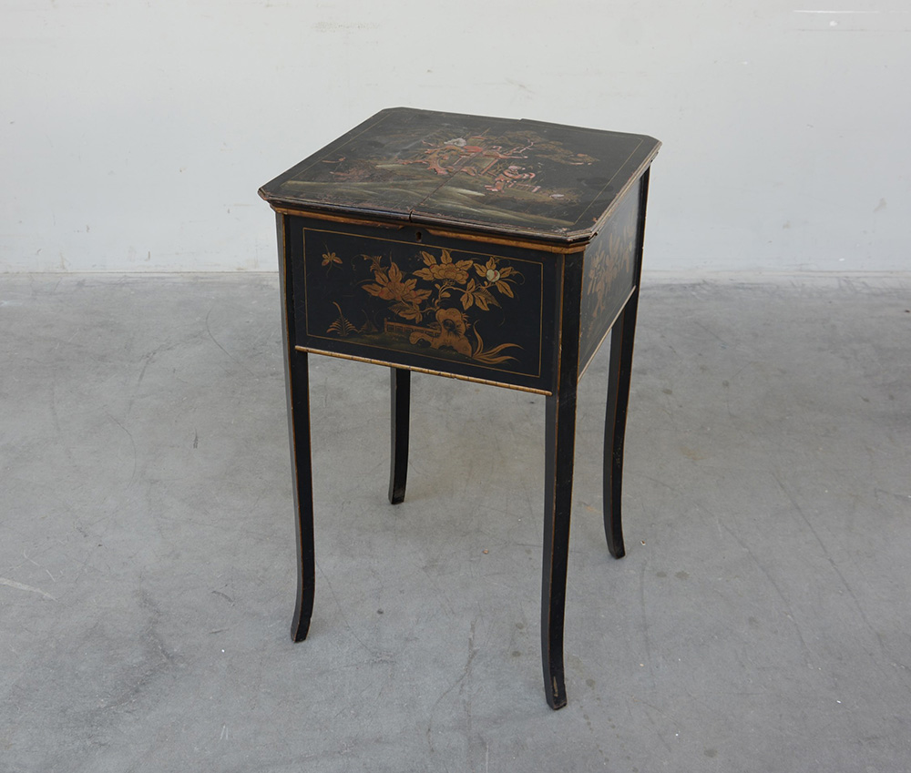 Tavolino da lavoro in legno laccato nero e decorato a cineserie in policromia e oro. Piano apribile celante scomparti e vano, gambe sagomate, fine Sec. XIX (cm 45x75x47) (difetti)