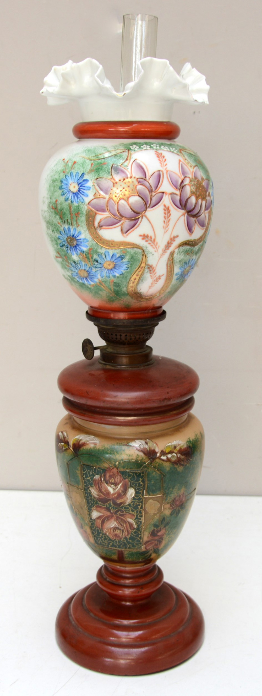 Lampada a petrolio con paralume in opaline decorato a fiori (h cm 60) (difetti e restauri)