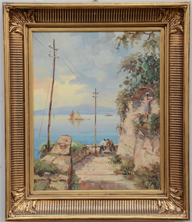 Firma indecifrata, "Sorrento" olio su cartone (cm 41x33) firmato e titolato in basso. In cornice
