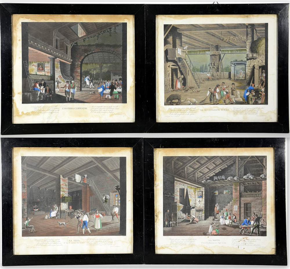 Gruppo di quattro litografie a colori del sec XIX. raffigurante scene...