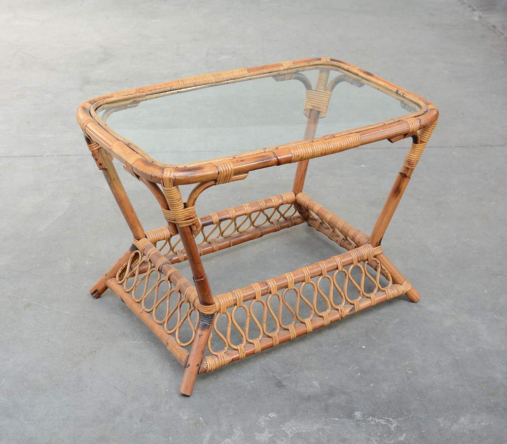 Tavolino da salotto rettangolare in bambù con fascia traforata e piano in vetro (cm 84x56x52)