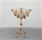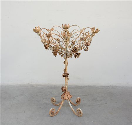 Fioriera in ferro battuto decorata a fiori e foglie, base sagomata terminante con piedini a ricciolo (h cm 96) (difetti)