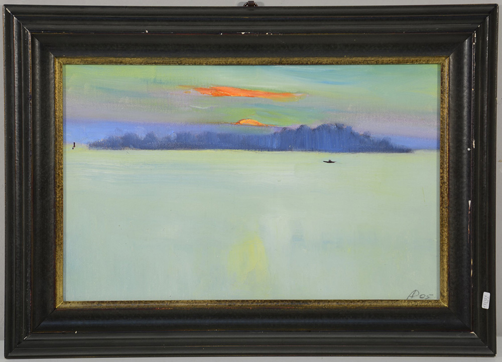 Ignoto, "Paesaggio fluviale al tramonto" olio su cartone (cm 24x38) firmato in basso a destra, iscritto e datato al retro. In cornice