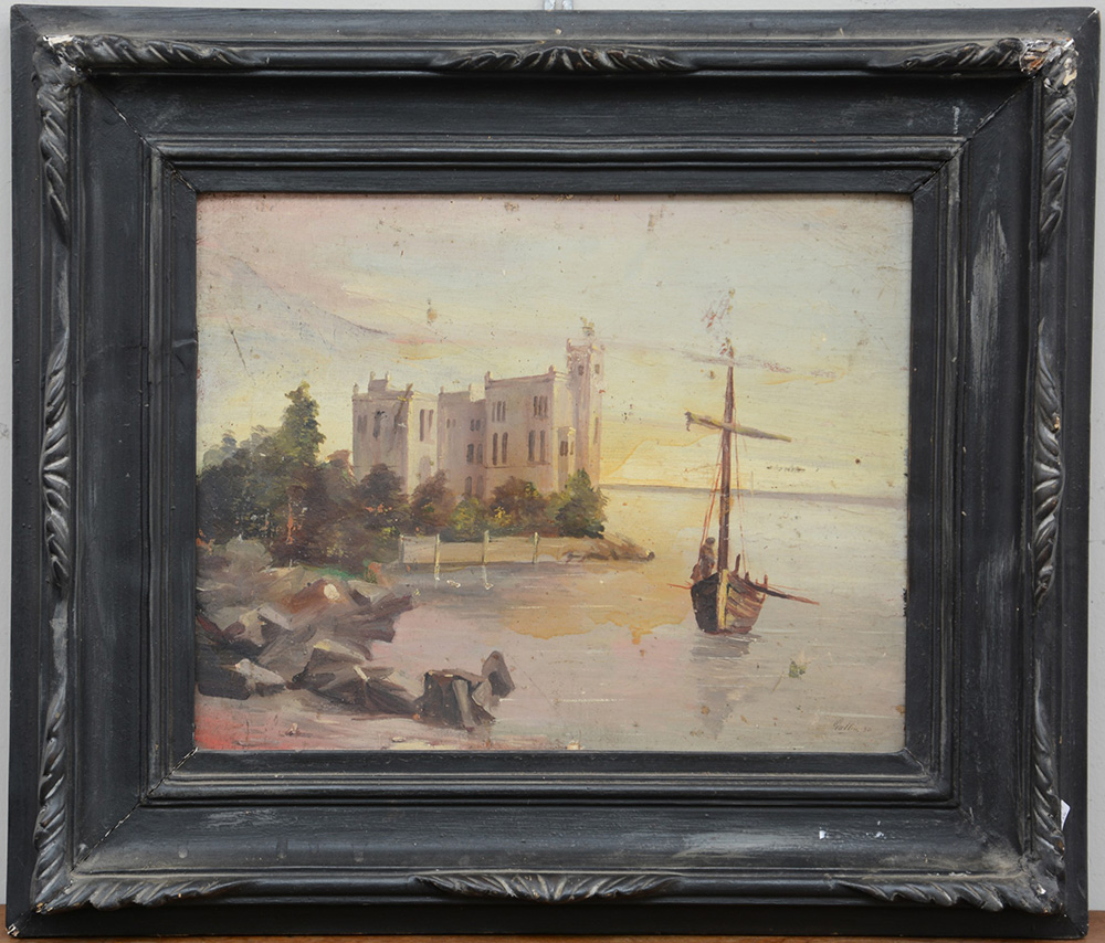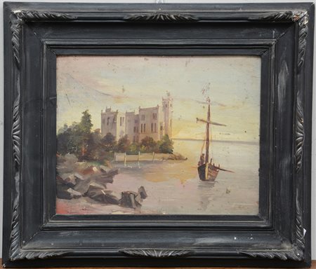 Gallin "Paesaggio marino con imbarcazione" olio su cartone (cm 31x40) firmato e datato in basso a destra. In cornice (difetti)