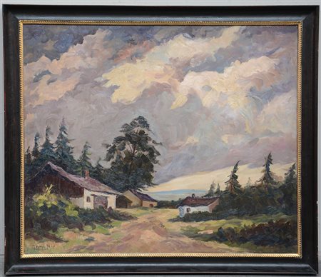 Joly Jenny "Paesaggio con baite" olio su tela (cm 76x91) firmato in basso a sinistra. In cornice