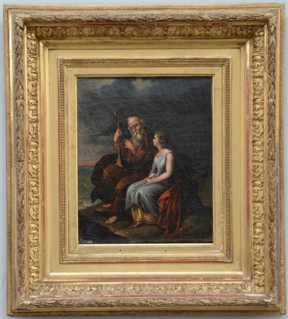 Scuola del Sec XIX, "Lezione di musica", olio su tela (cm 26x21). In cornice
