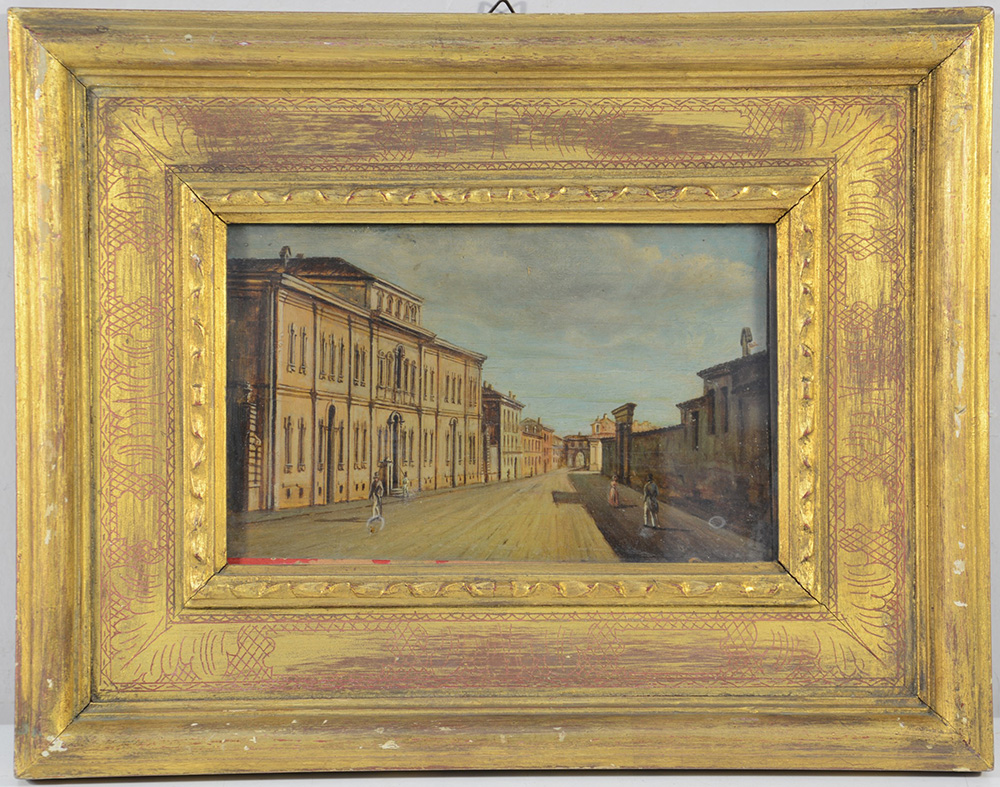 Lotto 1878 | Ignoto, "Scorcio di citt‡ con figure" olio su tavoletta (cm 16x26). In cornice