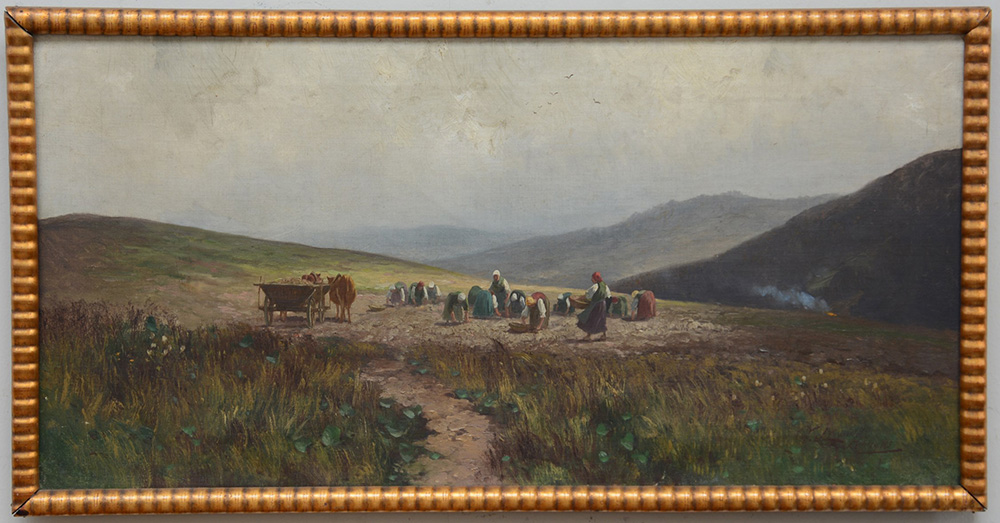 Firma indecifrata, "Paesaggio con contadine" olio su tela (cm 35x69) firmato, iscritto e datato 1903 in basso a destra. In cornice