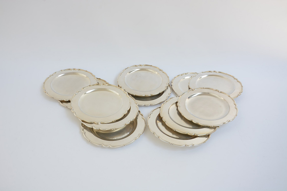Lotto in argento composto da dodici piatti di forma circolare lisci con bordura a volute. Milano, met‡ sec. XX (d. cm 19,5) (gr. 3400 ca.) (lievi difetti)