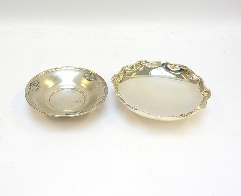 Due ciotole diverse in argento di forma circolare di cui una con turchesi. Italia, sec. XX (d. cm 23,5) (gr. lordi 600) (lievi difetti)
