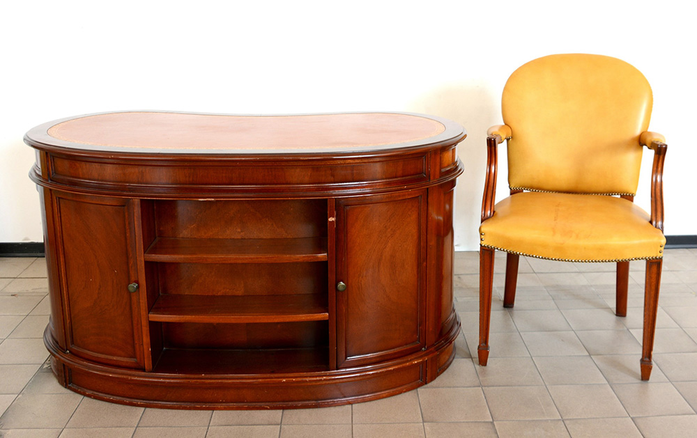 Scrivania a fagiolo da centro ad ante e cassettini con piano in pelle impresso in oro, unita a una poltoncina di simil decoro (cm 120x76x80) (difetti)
