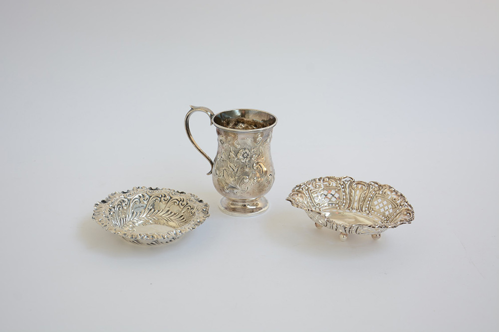 Lotto in argento composto da piccolo mug e due bonbondish. Inghilterra,...