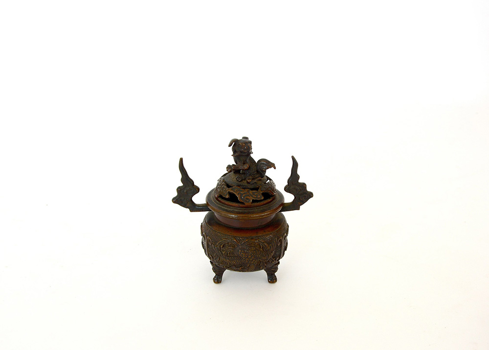 Piccolo incensiere biansato in bronzo decorato con fenici e sormontato da cani di Pho. Cina, sec, XX (h. cm 12,5)