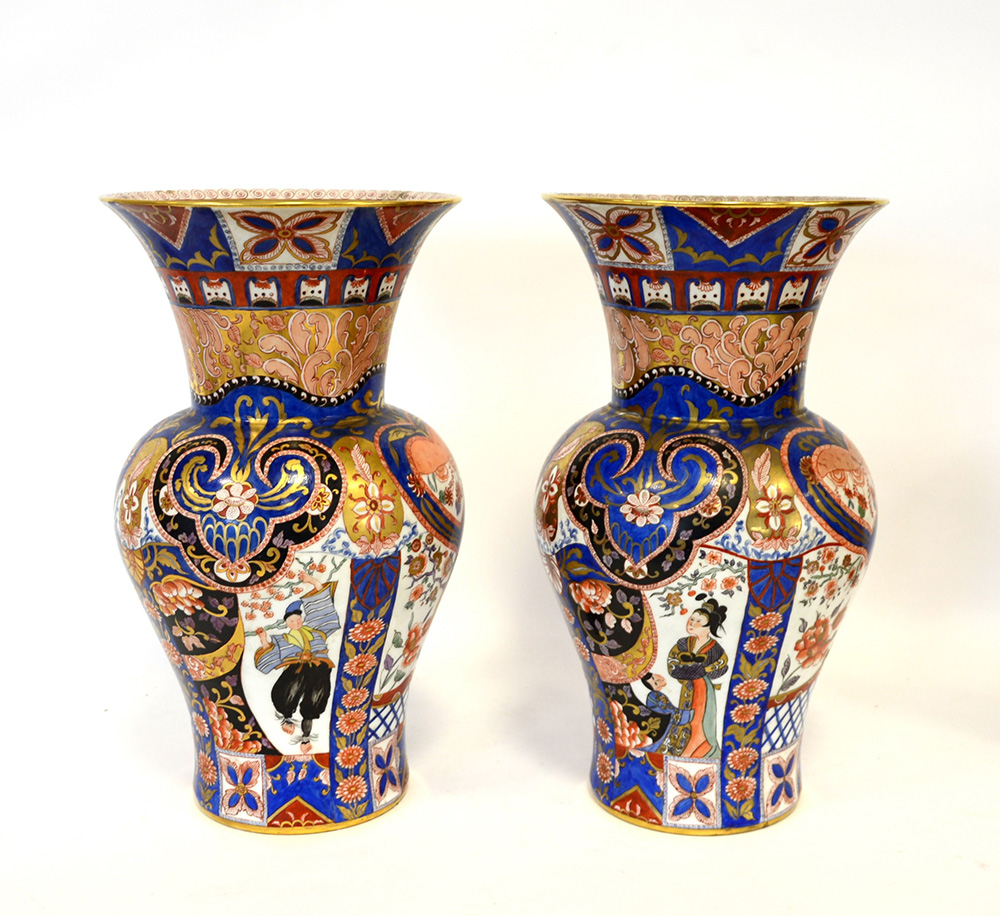 Coppia di vasi in porcellana decorata nei toni del blu e dorature a figure, paesaggi e fiori (h. cm 43) (difetti)