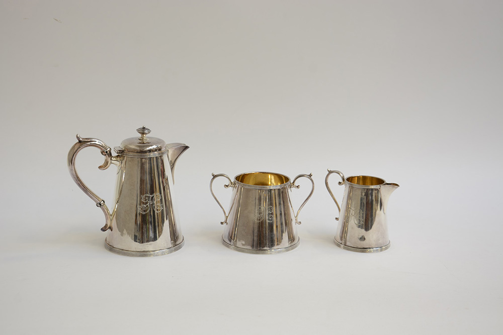 Parte di servizio da tË e caffË in metallo argentato, composto da teiera, lattiera e zuccheriera biansata