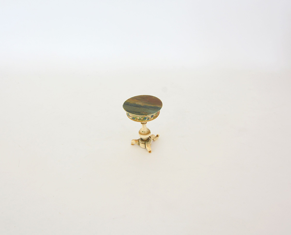 Arte del sec. XIX. Modello di tavolino in avorio con piano dipinto con paesaggio lacustre. Fasce decorate a rami policromi. Gamba tornita terminante a piedini sagomati (h. cm 8,5) (difetti e mancanze)