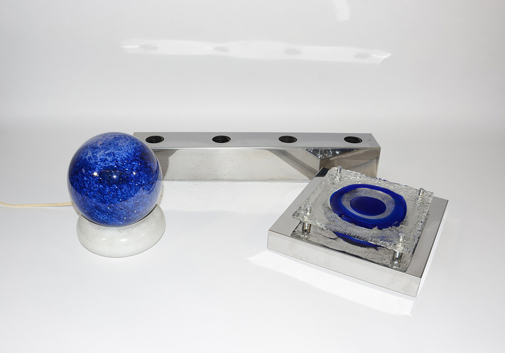 Lotto composto da una lapmada da tavolo con adesivo Targetti, una plafoniera in metallo cromato e vetro e un'applique a quattro luci (lievi difetti)