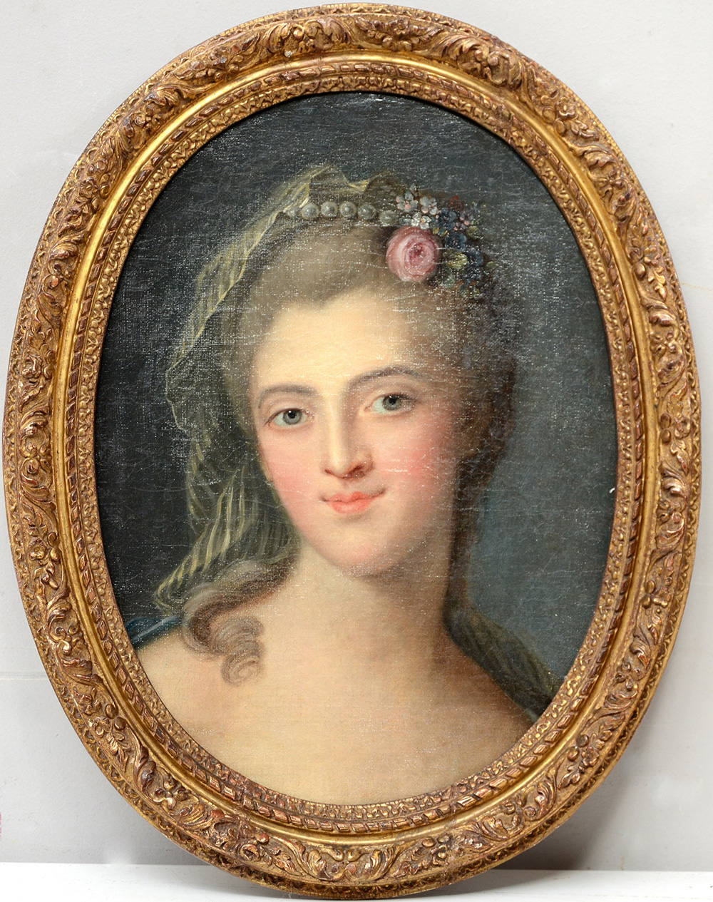 Scuola francese sec. XIX "Ritratto di donna" olio su tela ovale (cm 40x30) In cornice coeva (restauri)