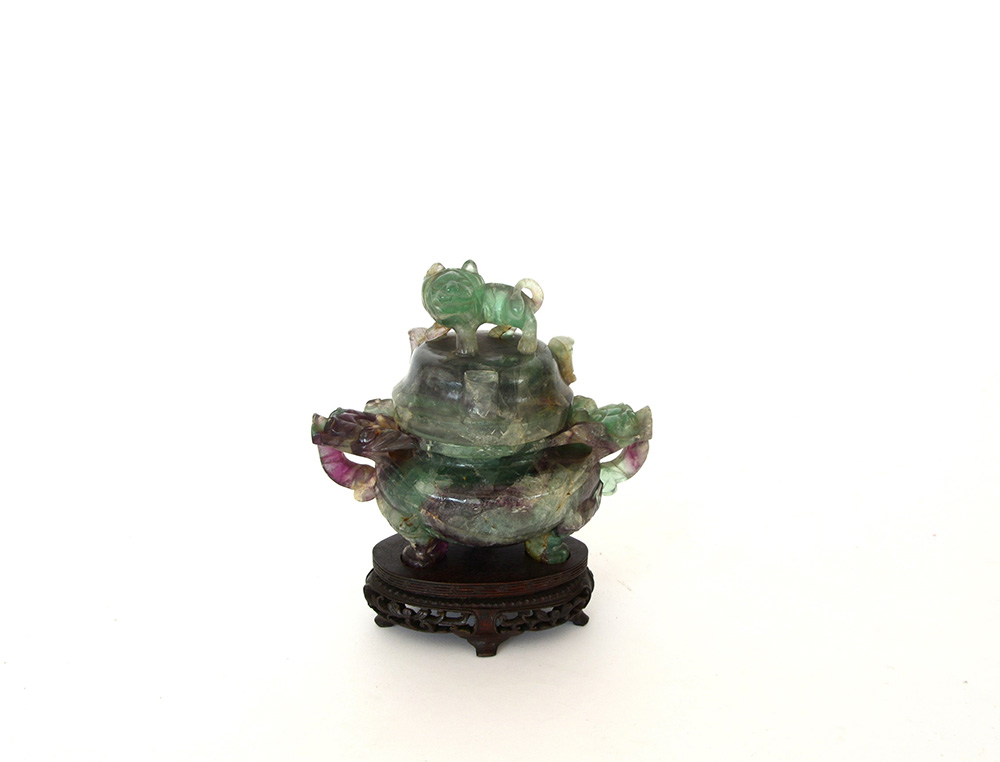 Arte cinese. Incensiera di forma arcaica in pietra dura decorata sul coperchio e sulle anse a cani di fo (h. cm 16) (difetti e restauri)