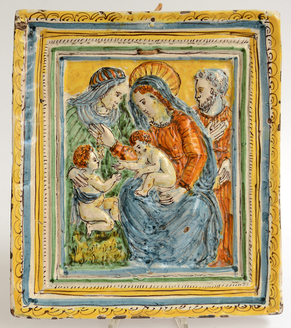 Targa devozionale plasticata a stampo in terracotta maiolicata e policroma raffigurante Sacra Famiglia con SantíAnna e S. Giovannino. Italia centrale, inizi sec. XVIII secolo (cm 30x27) (difetti)