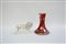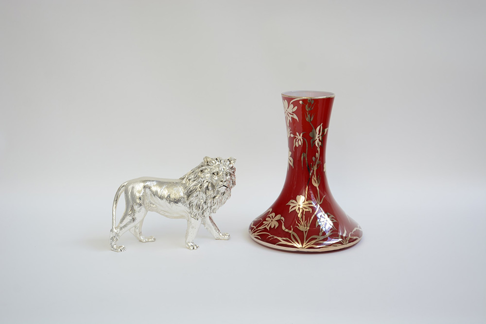Lotto composto da una sculura raffigurante un leone e un vaso in vetro a fondo rosso (difetti)