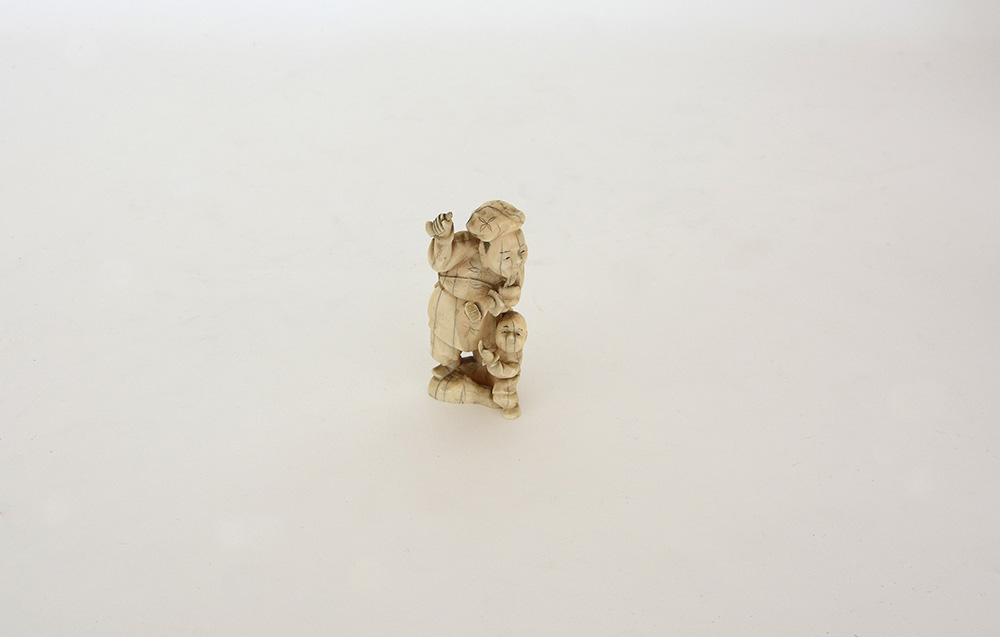 Scultura in avorio raffigurante uomo con bambino. Giappone, inizio sec. XX. (h. cm 9) (difetti)