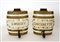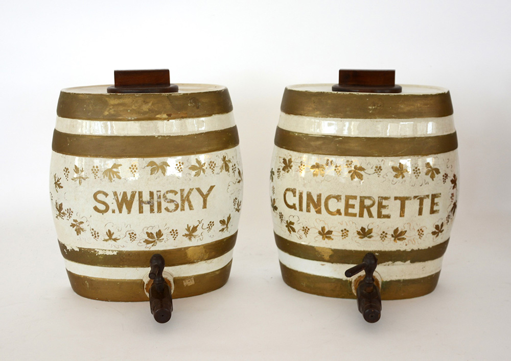 Manifattura fine sec. XIX. Coppia di botti in ceramica con tappi e rubinetti in legno decorati e inscritti con dorature "Wisky" e "Cinecrette" (h. cm 33) (restauri)