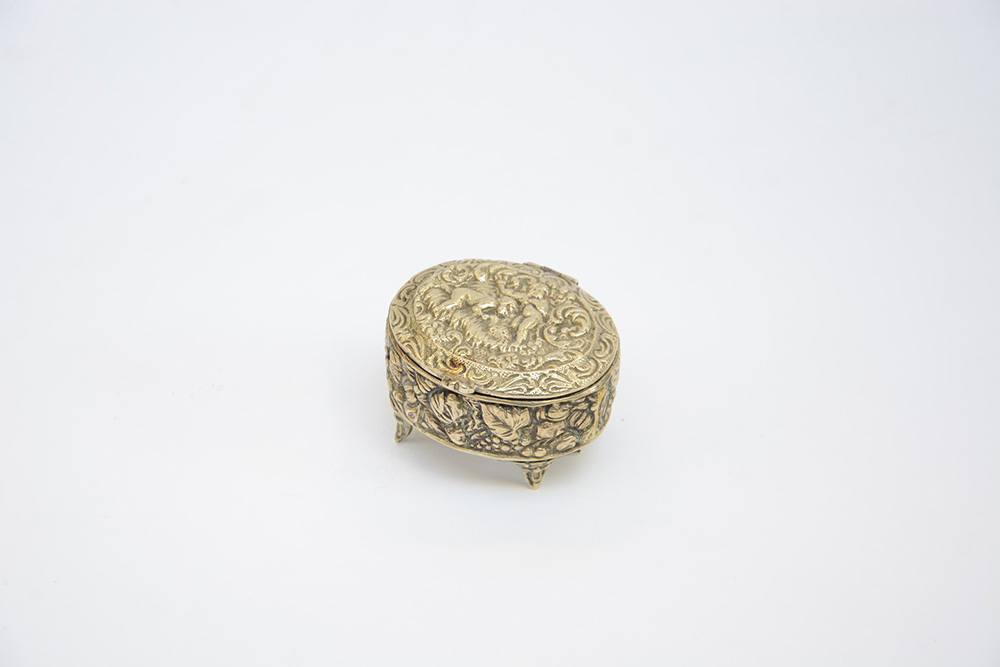 Cofanetto ovale in metallo argentato decorato in bassorilievo con vegetazione, frutti e putti (cm 7x4,5x6)(difetti)