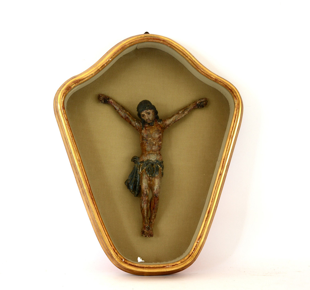 Arte dell'inizio del sec. XIX "Cristo crocifisso" scultura in legno decorata in policromia (h. cm 30) Contenuta in teca di epoca posteriore (difetti)
