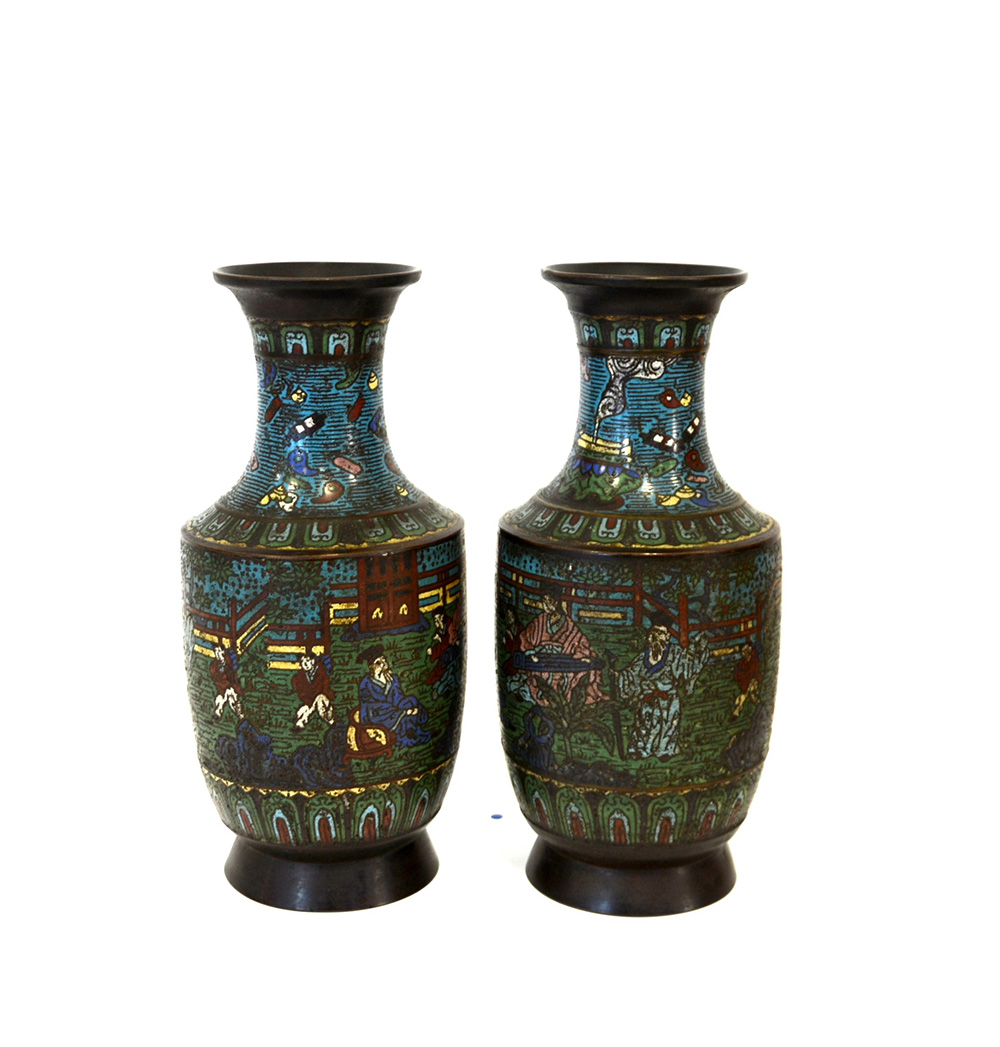 Coppia di vasi in metallo cloissonnÈ decorati in policromia a scene di palazzo. Cina, sec. XX (h. cm 38)