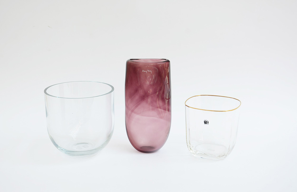 Lotto composto da un portafiori di Carlo Moretti, un vaso in vetro ametista firmato Henry Din e uno in vetro incolore (difetti)