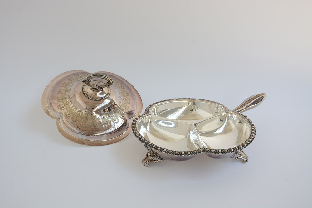Grande antipastiera con coperchio in metallo argentato decorato sul coperchio a motivi concatenati