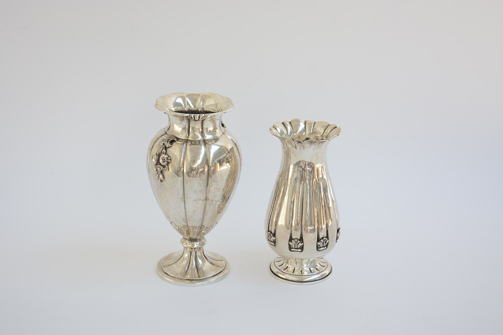 Lotto in argento composto da due vasi con corpo a balaustro di cui uno argentiere Miracoli e l'altro dell'Argentiere Cacchione. Italia, sec. XX (gr. 890 ca.) (h. max cm 23,5) (lievi difetti)