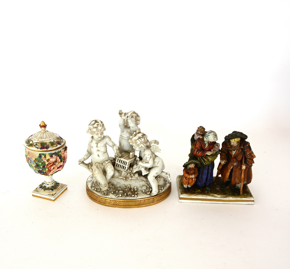 Manifatture diverse. Lotto composto da un gruppo in porcellana raffigurante putti, un vasetto in ceramica decorato a baccanti e una statuetta in porcellana raffigurante la famiglia (difetti)