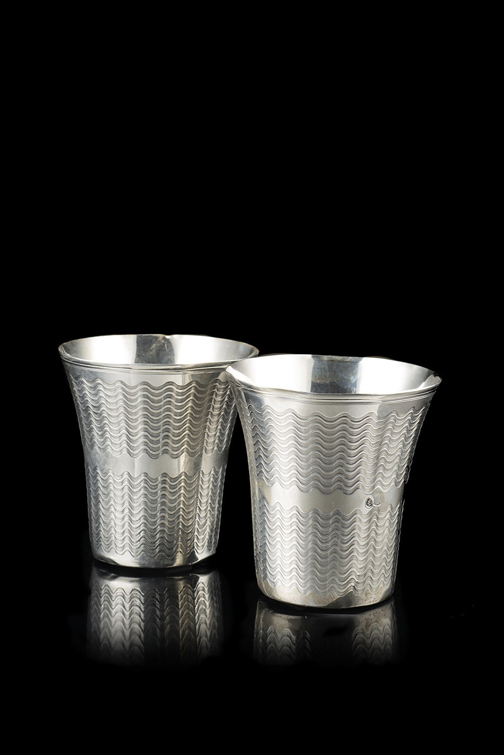 Coppia di bicchieri in argento di forma troncoconica svasata con superficie decorata a guillochÈ. Turchia, inizi sec. XX (h cm 9) (peso tot gr 180 ca.) (difetti)