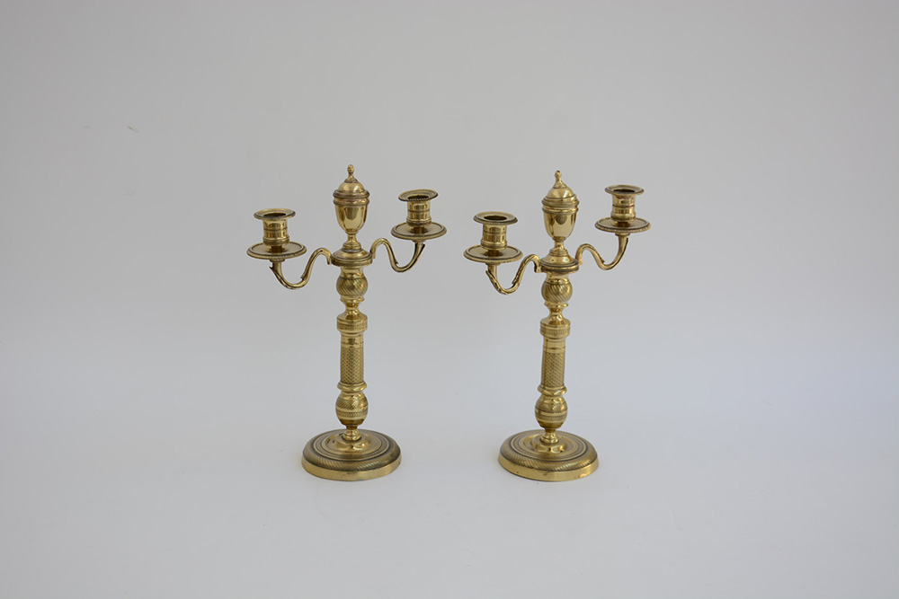 Coppia di candelieri a tre fiamme in ottone decorato a motivi stilizzati. Sec. XIX (h. cm 35)