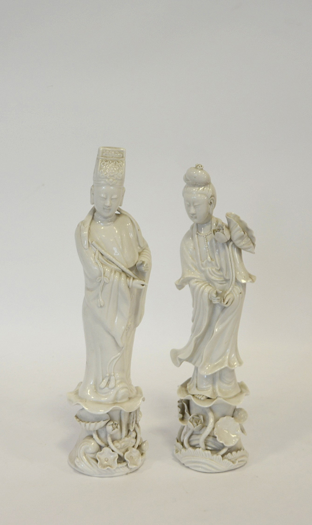 Due staute in Blanc-de-Chine, una raffigurante una Guanyin e una con...
