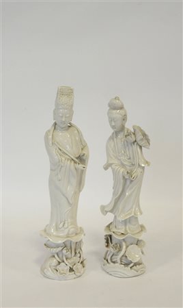 Due staute in Blanc-de-Chine, una raffigurante una Guanyin e una con immortale su base a fiore di loto. Cina, sec. XX (h cm 36) (difetti)