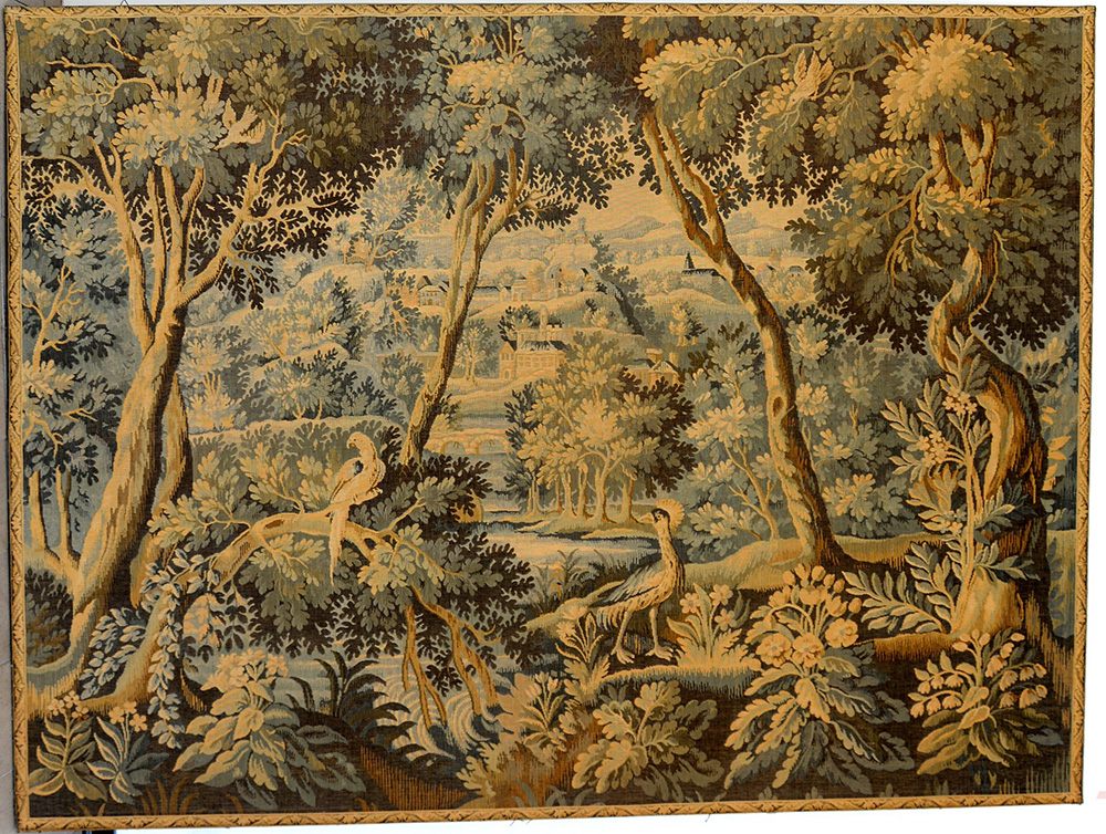 raffigurante verdura con uccelli e villaggio sullo sfondo.