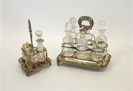 Lotto composto da due servizi da tavolo in metallo argentato con boccette in vetro (difetti e mancanze)