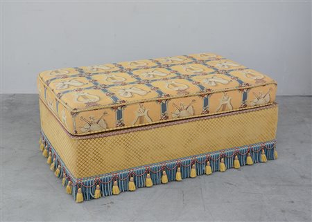 Pouf rettangolare con cuscino asportabile, rivestimento in tessuto operato e passamaneria a frange (cm 121x50x72) (difetti)