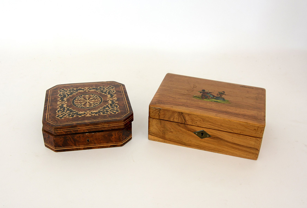 Lotto composto da due scatole in legno di diversa epoca e decoro (difetti)