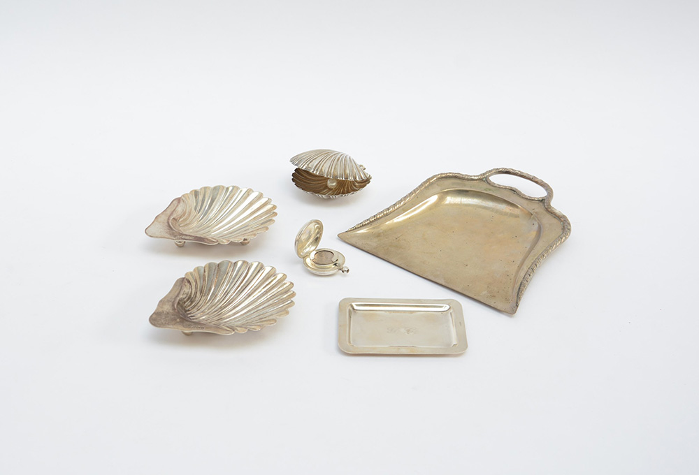Lotto in argento composto da una paletta raccoglibriciole, due contenitori a forma di conchiglia. Citt‡ di Sheffield, 1908. Argentiere Martin & Webb, un portamonete Birmingham 1908 e due bomboniere (gr 390 ca.) (difetti)