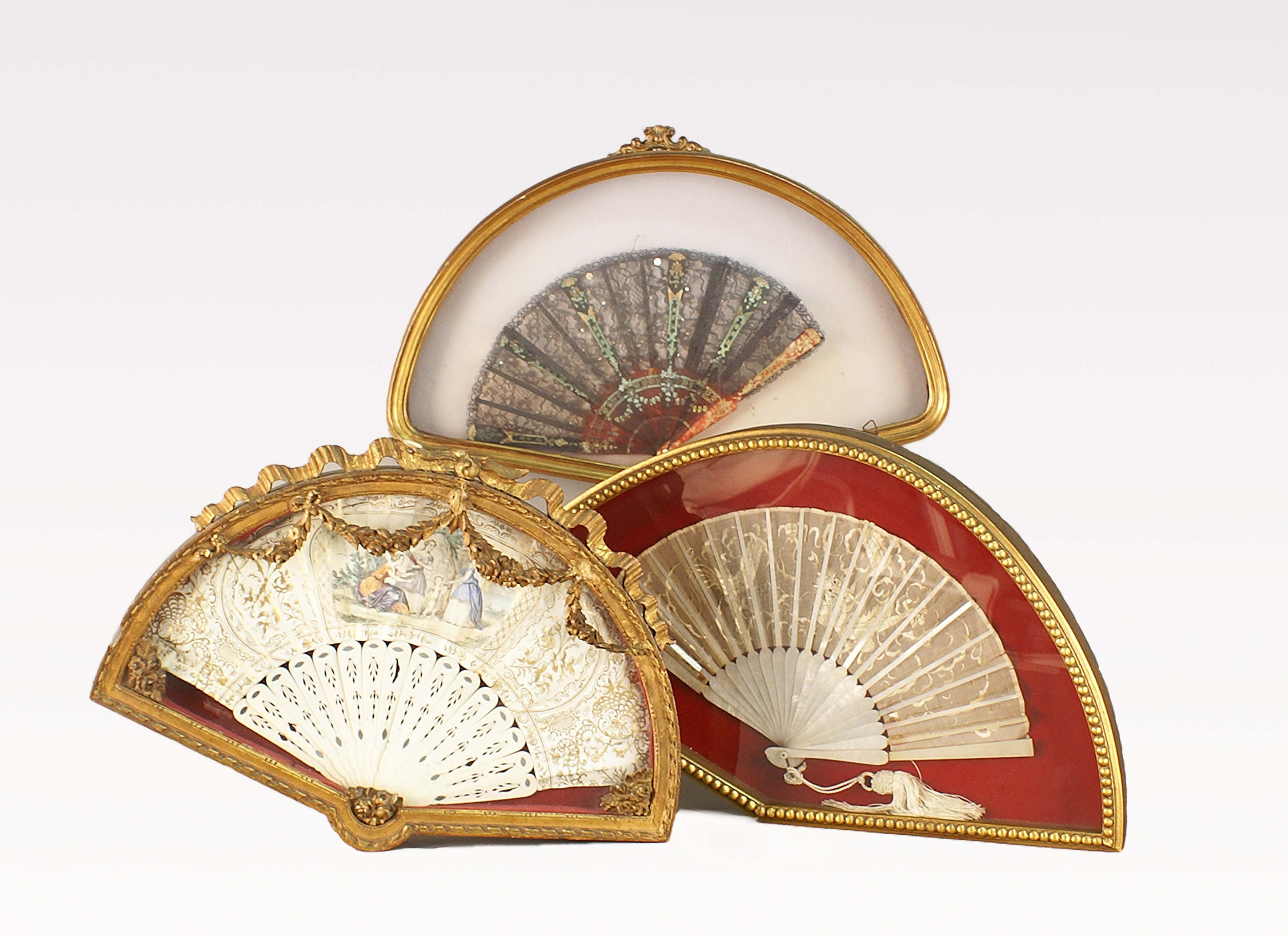 Lotto 67 | Lotto composto da tre antichi ventagli dipinti entro cornici in legno, XIX...