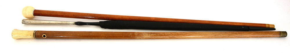 Lotto composto da due bastoni del sec. XIX con pomoli in avorio e un ombrello di diversa epoca (difetti)