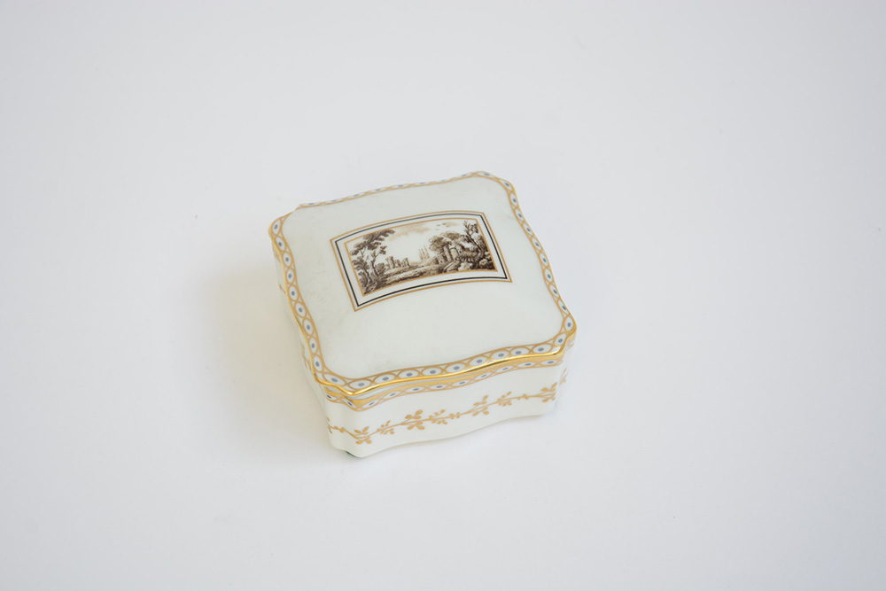 Manifattura di Ginori, pittoria di Doccia. Scatola in porcellana decorata sul coperchio a paesaggio monocromo