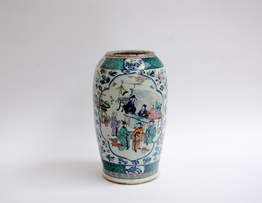 Vaso in porcellana bianca e blu e smalti policromi decorato con figure in scene d'interni e motivi floreali e farfalle. Cina, fine sec. XIX (h. 62 cm.) (gravi difetti)