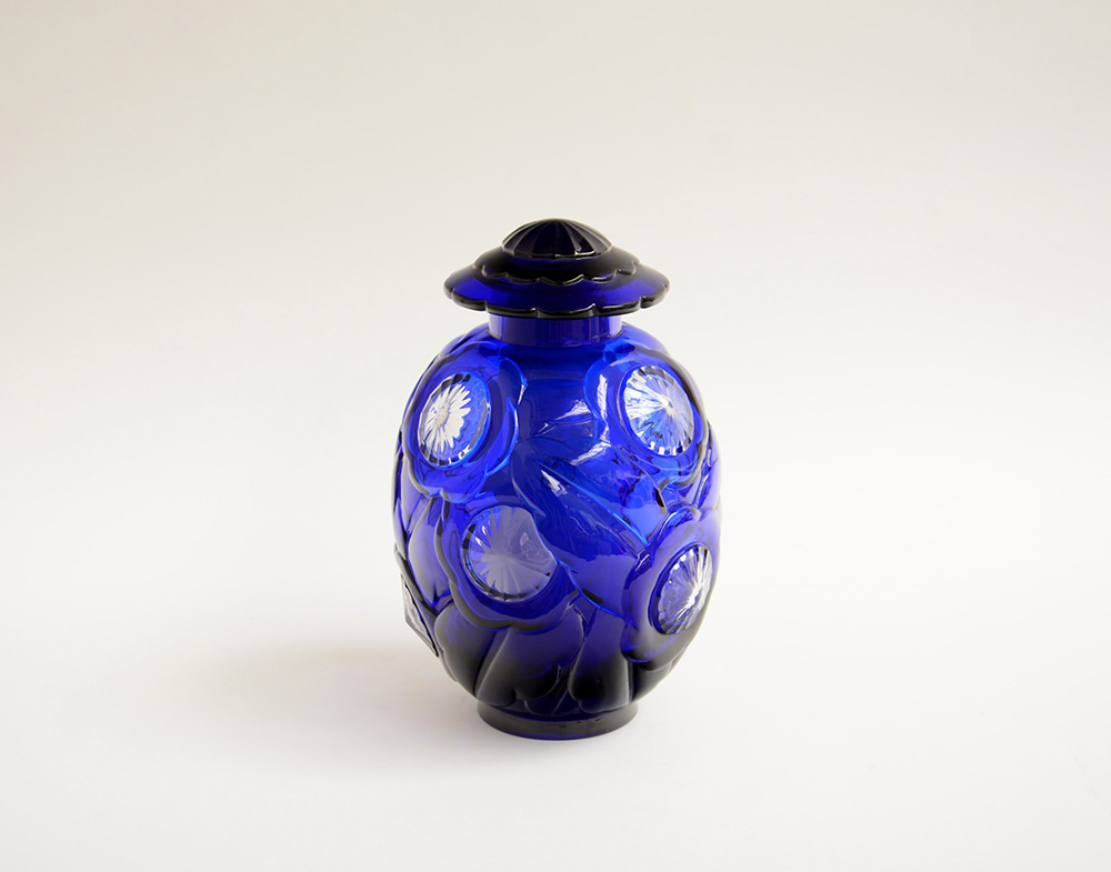Manifattura Baccarat. Vaso con coperchio in vetro soffiato in stampo blu e...